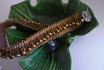 Glass beads, pearls, steel cut antique button clasp