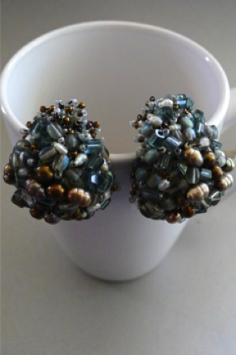 “Earrings 9” Glass beads, pearls; approximately 1” x .5”