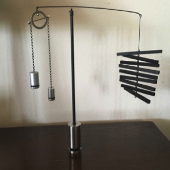 Steel wire, found objects: Stainless steel sign standoffs, computer ring, wood, beads, brass rod