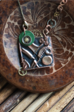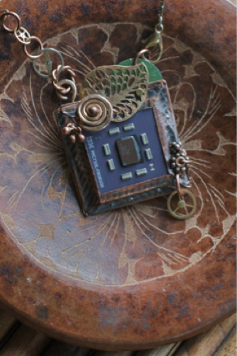 Brass stampings, computer chip, watch parts, brass, copper repoussé. Approximately 2” x 1.5”.