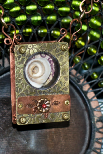 Stamped brass, hammered and embossed copper, paper, seashell. Approximately 2” x 1.25”