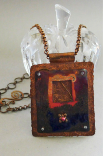 Enamel on flame patina copper, textured copper background.