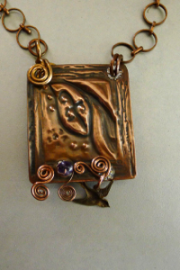 Textured and repoussé copper frame, feathers, paper, semi-precious stone, brass wire and brass stamping.