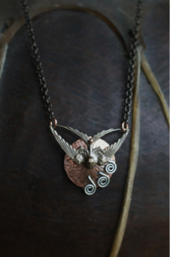 Stamped brass, sterling silver on textured copper. Approximately 1.25” x 1.25” overall on 18” chain