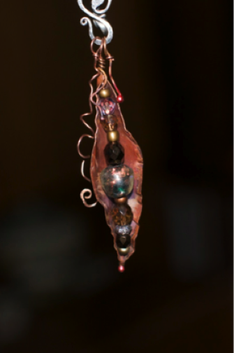 Fold formed, flame patina finished copper, glass beads; approximately 2.5” x .75”