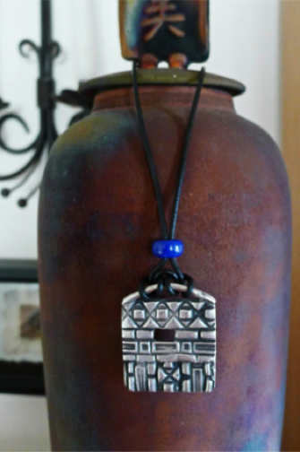 Silver clay, glass bead Approximately 1.5” x 1.25” overall, on leather cord.